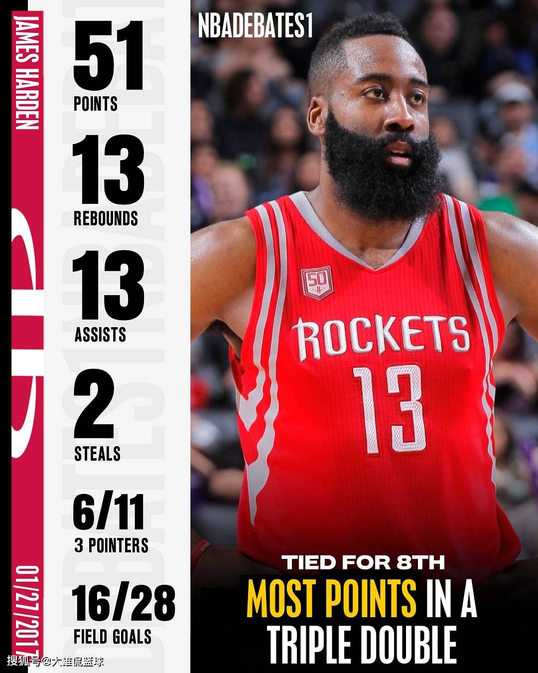 2017年1月27日,整场比赛28投16中,三分球11投6中,拿下了51分,13个篮板,13次助攻,2次抢断的大号三双数据。詹姆斯哈登在休斯顿火箭的时候,是球队的核心领袖,拥有绝对的球权战术地位。可惜,当初为了一个夺冠机会,放弃火箭提供的2年1亿美元合同,逼宫火箭将自己交易到布鲁克林篮网。