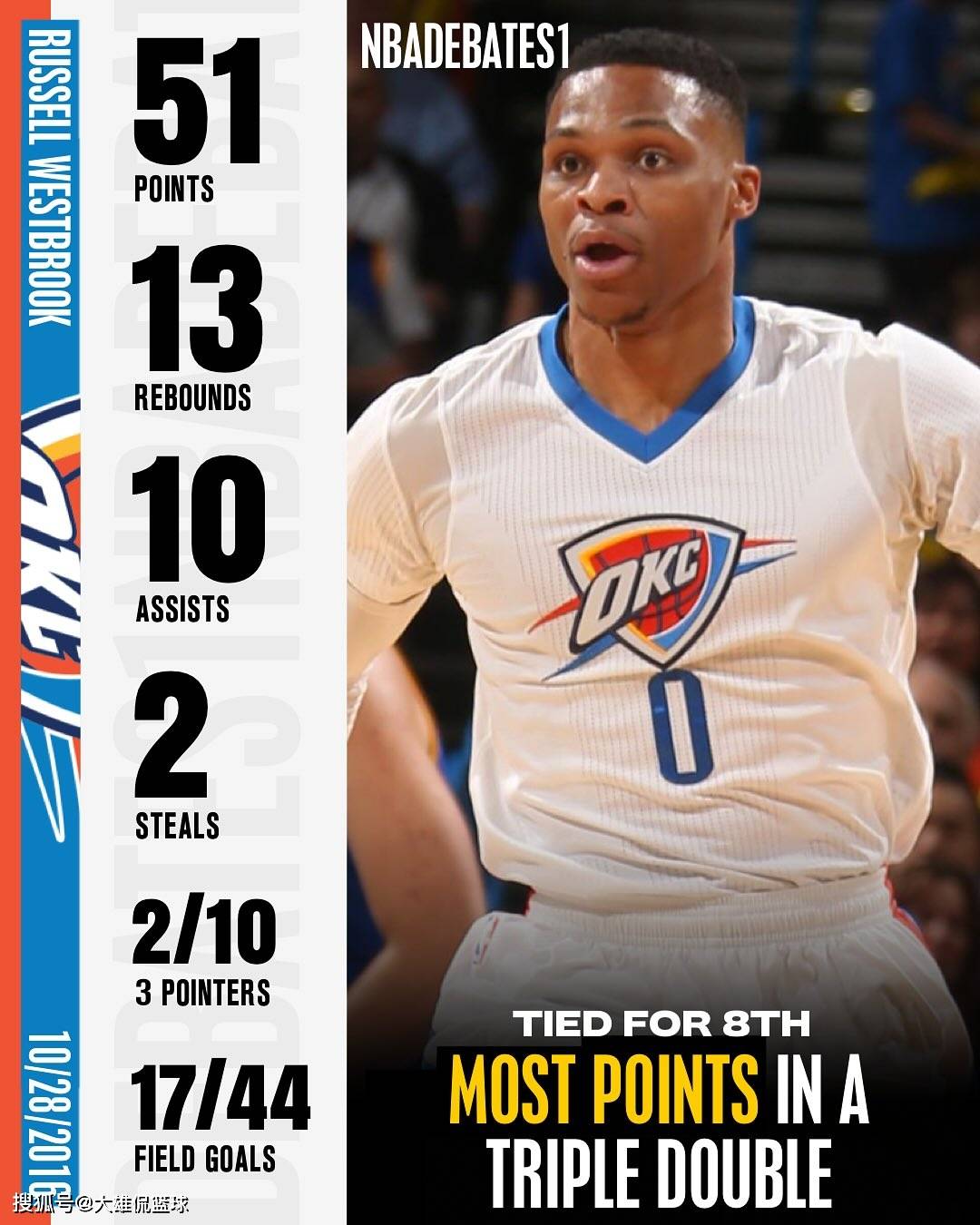 2016年10月28日,整场比赛44投17中,三分球10投2中,拿下了51分,13个篮板,10次助攻,2次抢断的大号三双数据。