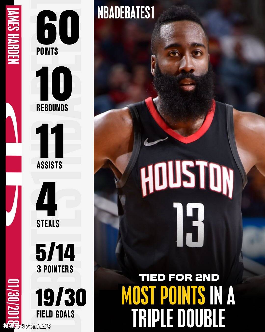 2018年1月30日,詹姆斯哈登整场比赛30投19中,三分球14投5中,拿下了60分,10个篮板,11次助攻,4次抢断的大号三双数据。