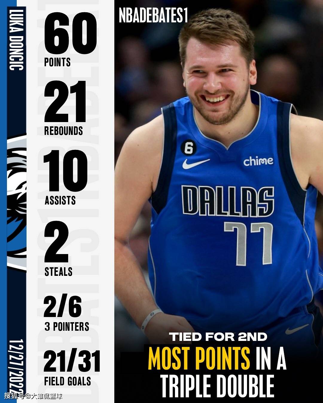 2022年12月27日,卢卡东契奇整场比赛31投21中,三分球6投2中,拿下了60分,21个篮板,10次助攻,2次抢断的大号三双数据。以卢卡东契奇的实力,现在刷三双数据太容易。在洛杉矶湖人,只要勒布朗詹姆斯一旦退役或者离开,他的数据可能会暴涨不少。