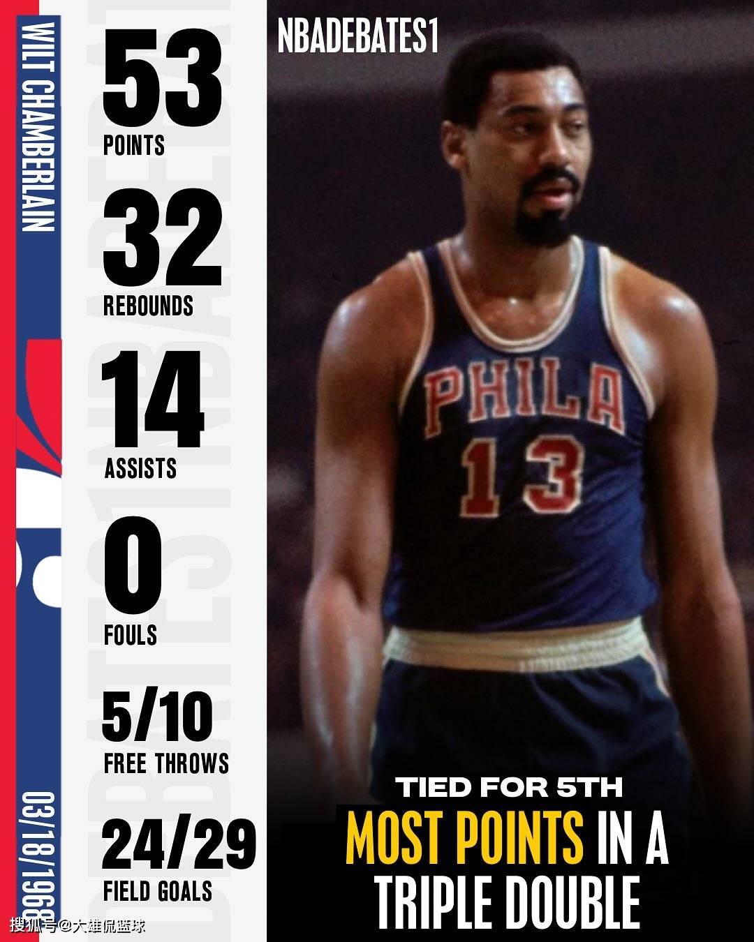 1968年3月18日,整场比赛29投24中,罚球10投5中,拿下了53分,32个篮板,14次助攻的大号三双数据。