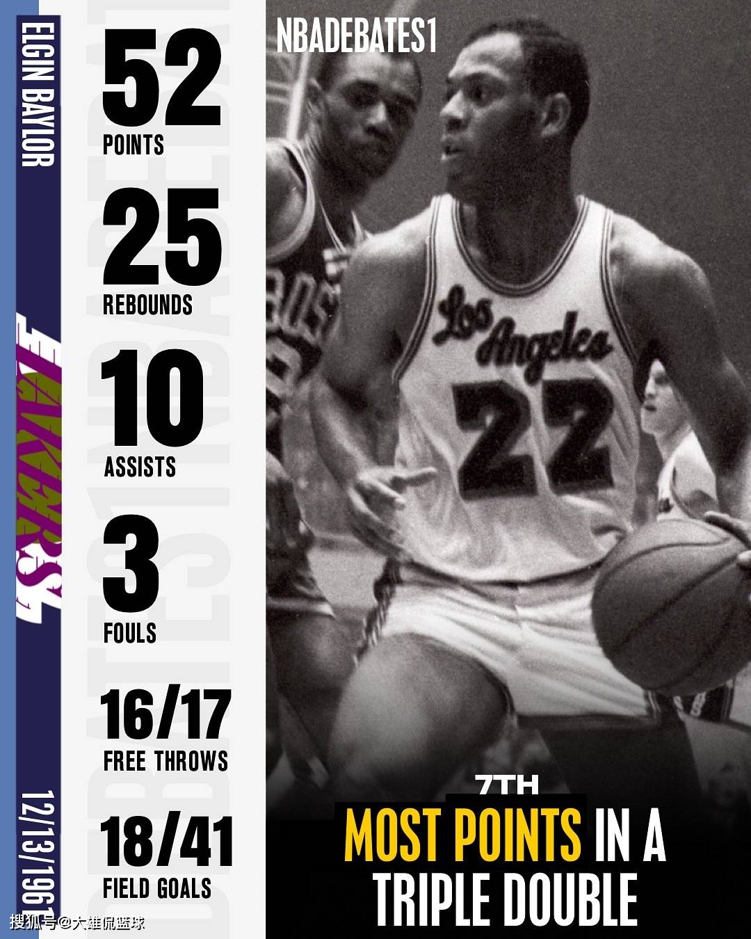 1961年12月13日,整场比赛41投18中,罚球17投16中,拿下了52分,25个篮板,10次助攻,3次盖帽的大号三双数据。
