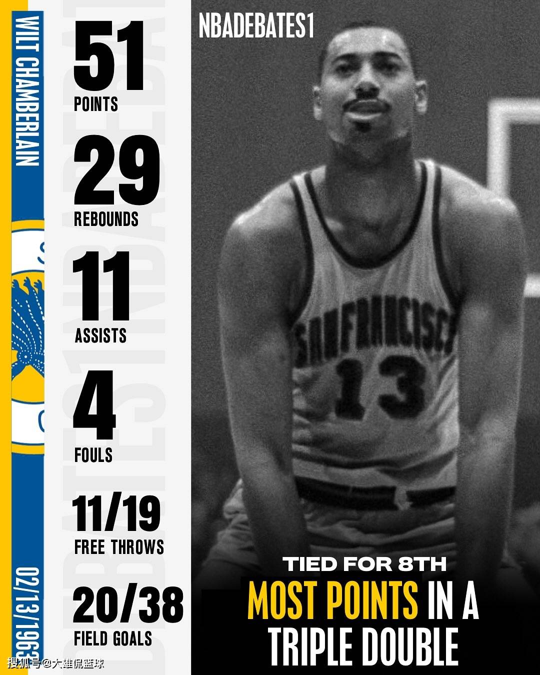 1963年2月13日,整场比赛38投20中,罚球19投11中,拿下了51分,29个篮板,11次助攻,4次盖帽的大号三双数据。张伯伦如果在今天的NBA打球,绝对是历史第一数据之王。
