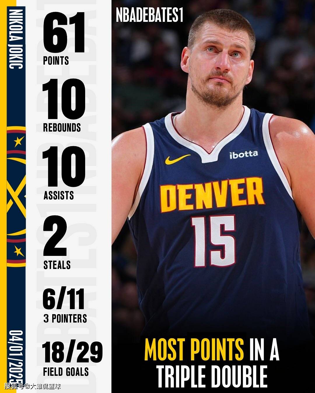 2025年4月1日,整场比赛29投18中,三分球11投6中,拿下了61分,10个篮板,10次助攻,2次抢断的大号三双数据。约基奇可是现役第一人,以他的实力,想要刷数据,现役目前没有人能刷得过他,太全面了。返回搜狐,查看更多