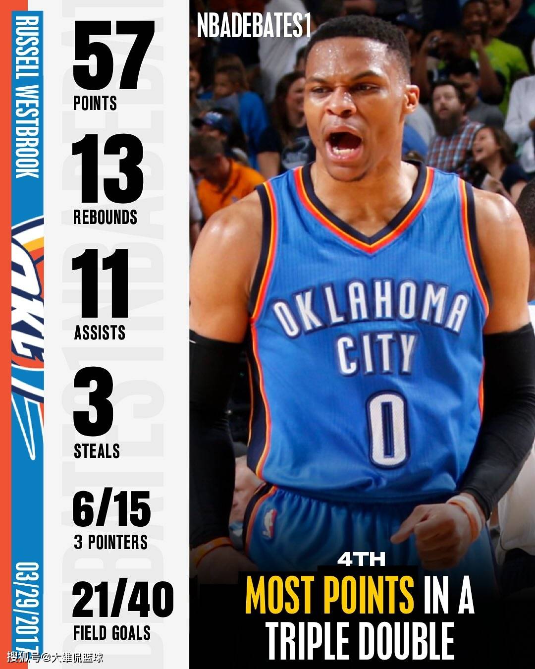 2017年3月29日,威少整场比赛40投21中,三分球15投6中,拿下了57分,13个篮板,11次助攻,3次抢断的大号三双数据。