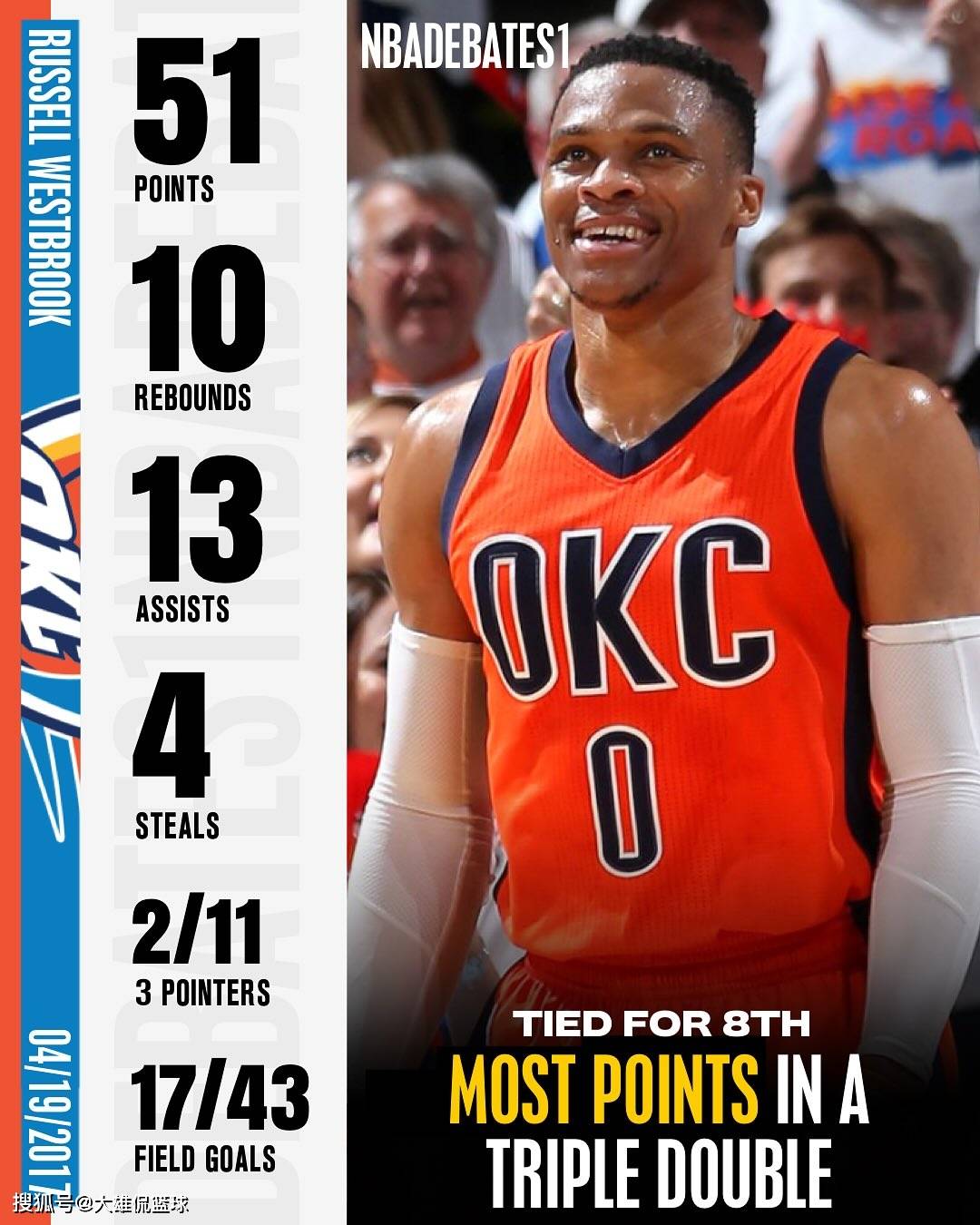 2017年4月19日,威少整场比赛43投17中,三分球11投2中,拿下了51分,10个篮板,13次助攻,4次抢断的大号三双数据。威少能打出这么多三双的数据,这得感谢杜兰特的背刺,他若没有离开,威少无法获得绝对的球权和战术地位。