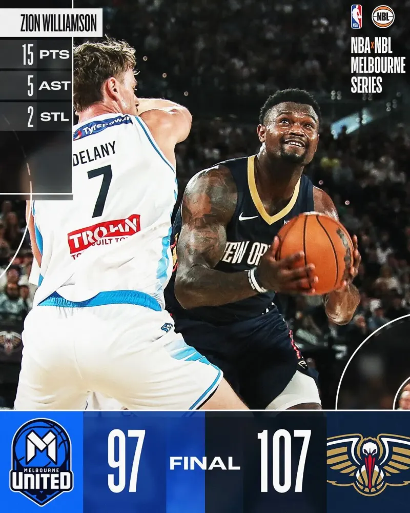 “蔡恩-威廉森16分钟15分,并带领鹈鹕在墨尔本取得胜利!”NBA官方附文道。