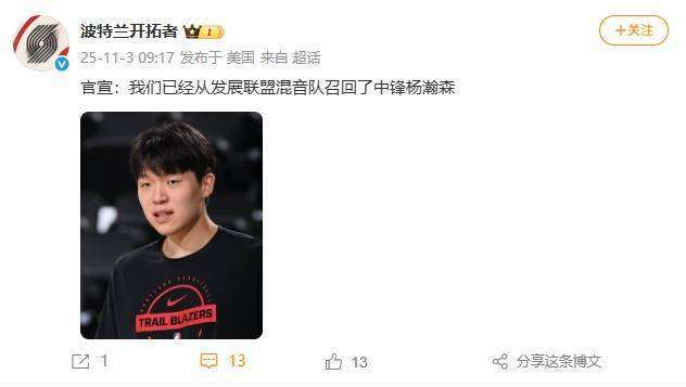 今天稍早,开拓者方面发布了关于杨瀚森的动态,球队表示,杨瀚森已被下放至NBA发展联盟的撕裂之城混音队,进行例行训练。而今天训练结束后,杨瀚森将从混音队被召回,准备为接下来的比赛做准备。