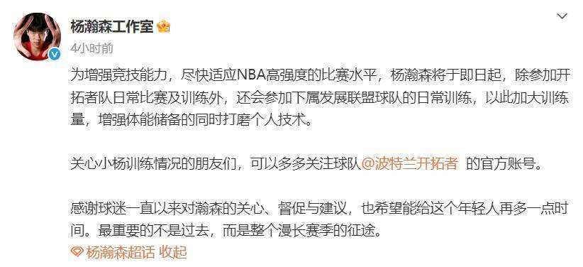随后,杨瀚森的工作室也在社交媒体上更新了消息,表示为了增强竞技能力,尽快适应NBA高强度的比赛水平,杨瀚森将会参加开拓者队的日常比赛和训练,并同时参与发展联盟球队的训练。工作室还表示,杨瀚森需要增加训练量,提升体能并磨练个人技术。