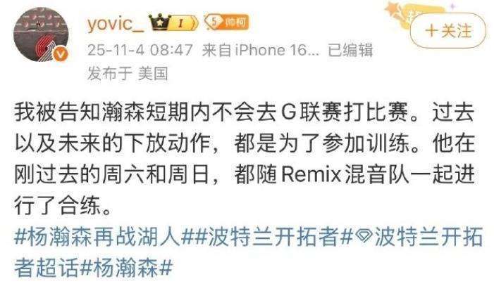 据红星新闻的报道,开拓者记者Yovic透露,杨瀚森短期内不会再前往G联赛比赛。过去及未来的下放,主要是为了参加训练而非比赛。上周六和周日,杨瀚森一直与混音队共同训练。