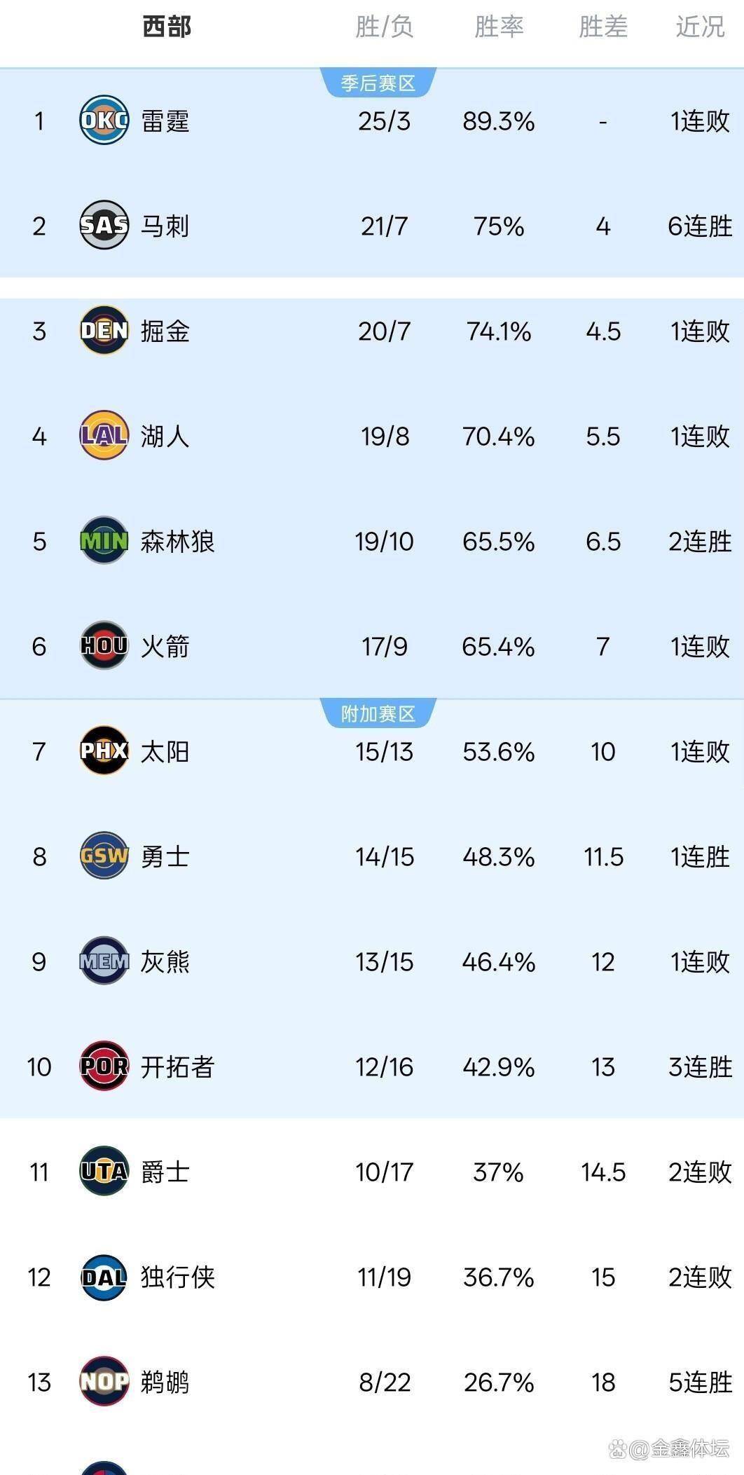 独行侠则不得不吞下两连败的苦果。 尽管浓眉近期状态火爆,过去5场4次砍下20+、4次两双,但球队整体防守漏洞百出,进攻端过于依赖个人能力。 他们目前以11胜19负排在西部第11位,季后赛前景再度蒙上阴影。